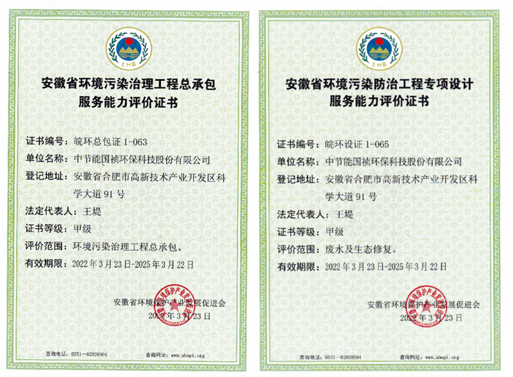 3月23日,經(jīng)過前期材料準(zhǔn)備、專家評審及實(shí)地考察,中節(jié)能國禎獲得安徽省環(huán)境保護(hù)產(chǎn)業(yè)發(fā)展促進(jìn)會(huì)頒發(fā)的《安徽省環(huán)境污染治理工程總承包服務(wù)能力評價(jià)證書(環(huán)境污染治理工程總承包甲級(jí))》、《安徽省環(huán)境污染防治工程專項(xiàng)設(shè)計(jì)服務(wù)能力評價(jià)證書(廢水及生態(tài)修復(fù)甲級(jí))》兩項(xiàng)證書。